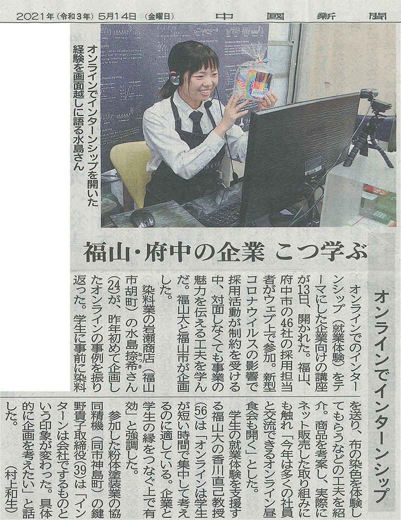 メディア掲載情報 · 14日 5月 2021 掲載情報 2021年5月14日 中国新聞 【掲載情報】 中国新聞に掲載していただきました。 昨年岩瀬商店が取り組んだ大学生向けの「オンライン インターンシップ(就業体験)」について、企業向けにスタッフが講義しました。 その様子を取材していただいています。 tagPlaceholderカテゴリ: プレスリリース コメントをお書きください コメント: 0