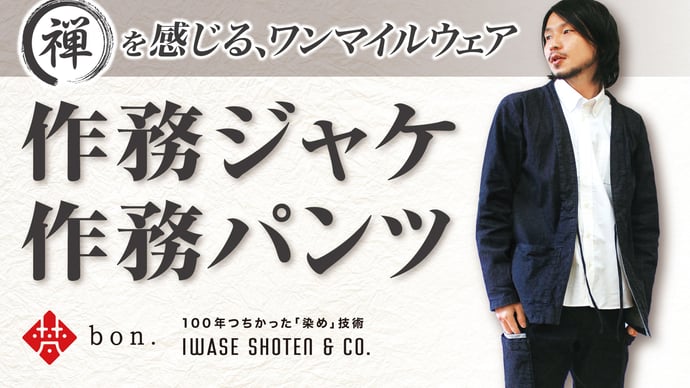 今回は、福山市で活躍される企業様の知識や技術を取り入れたアイテム「作務ジャケ」「作務パンツ」の2点です。