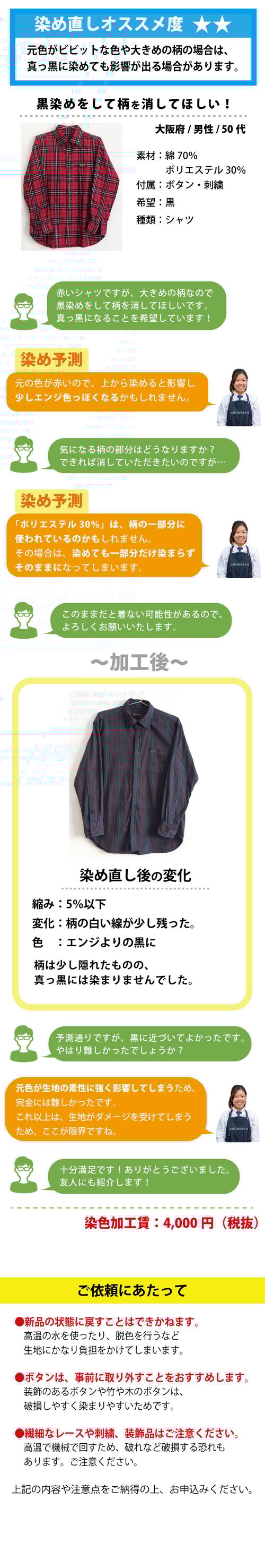 12日 5月 2020 大柄チェックシャツ 黒染め ご依頼品が予測通りに仕上がるか、★の数で表しています。 ★★★・・・ほぼ予測通りです。おすすめします。 ★★ ・・・少し難しいですが、染めることは可能です。 ★ ・・・予測通りに仕上げることは、ほぼ難しいです。あまりおすすめできません。 0 ・・・染め直しをおすすめできません。大変難しいです。 tagPlaceholderカテゴリ: 製品・サービス/染め直しサービス