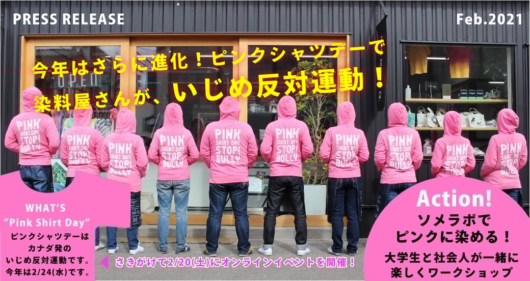 2/20(土)オンラインイベント当日は、染めたピンク色の衣類を着用し、みんなで学び、SNSなどで公開しいじめ反対の啓発をお願いしていきます!