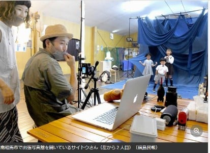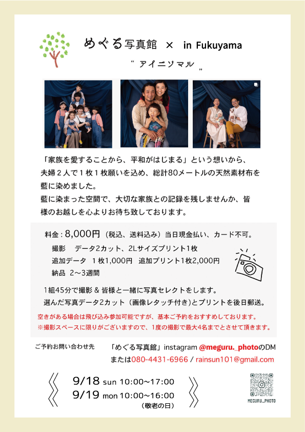 「家族を愛することから、平和がはじまる」という思いを込めて、藍色に染めた布で背景を彩る。サイトウさんが家族の大切さや写真を残すことの意義を再認識したのは東日本大震災だ。家族を亡くした友人から「写真を撮っておけばよかった」と聞いた。家族写真を撮る機会は少ない。「出張写真館を特別なイベントとして足を運んでもらい、記念に残すきっかけになってほしい」と話す。