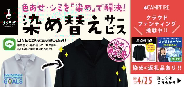 解決するサービス、「染め替えサービス」を始めるにあたり、「CAMPFIRE」にてクラウドファンディングを行うこととなりました。2020年たくさんの価値観が変化した時代だからこそ、染めを通じて伝えたい想いがたくさんあります。