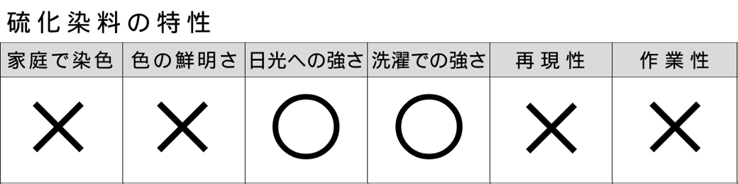 硫化染料とは、染料に硫黄原子を含む染料で、硫化ナトリウムを加えたアルカリ性還元浴で染めます。 一般的に不鮮明な色相ですが、複雑で味わいのある色をしています。塩素漂白に弱く、再現性はあまりありません。 また、高濃度で染めて洗浄が不十分の場合、日が経つと染料の硫黄分が酸化して硫酸に変わり、セルロ-ス繊維を脆化させる欠点があります。デニムの染色にも使用されています。